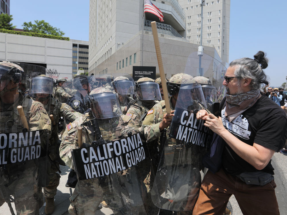 2025年6月8日,正在美国加利福尼亚州市核心的联邦法律机构门前,者取国卫队人员发生冲突。发(邱晨摄)。